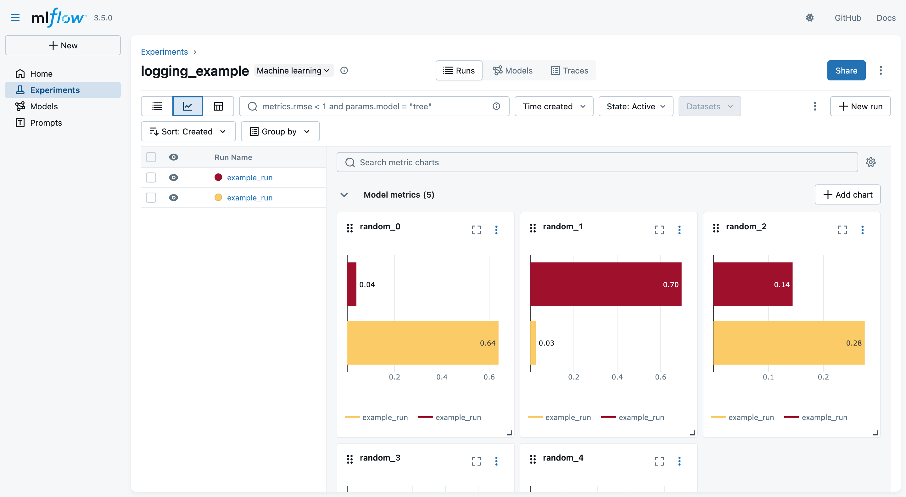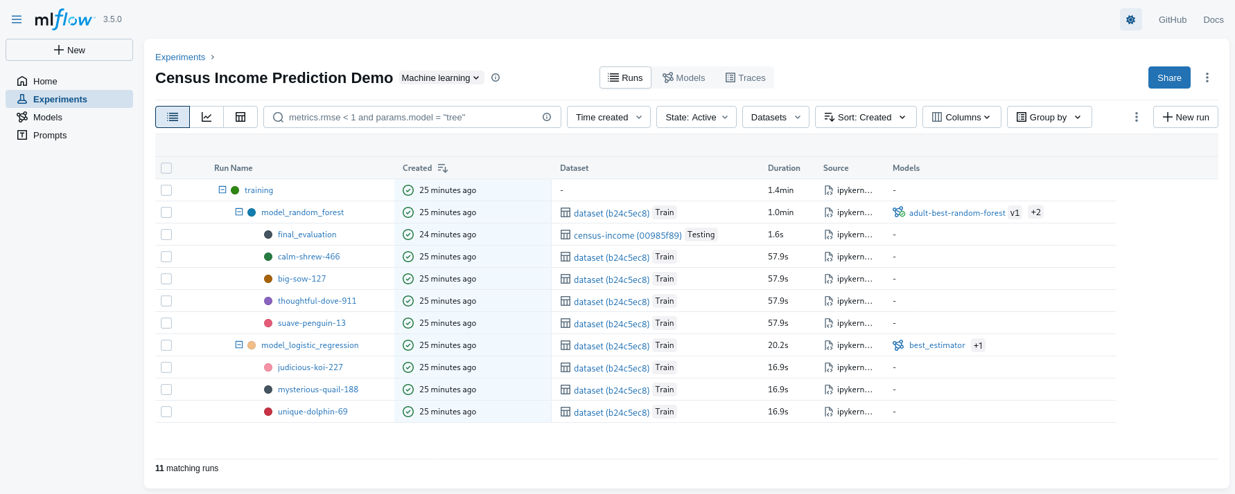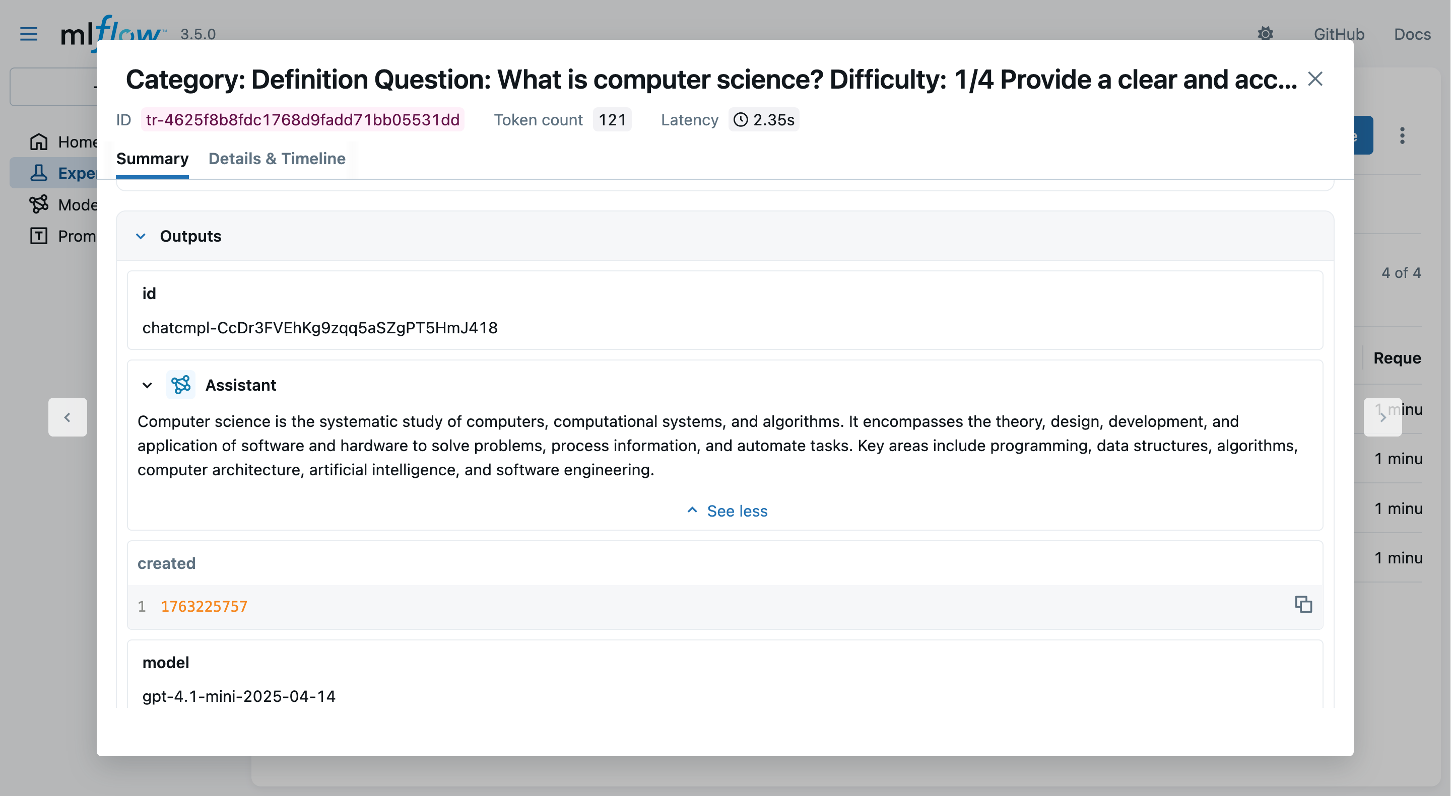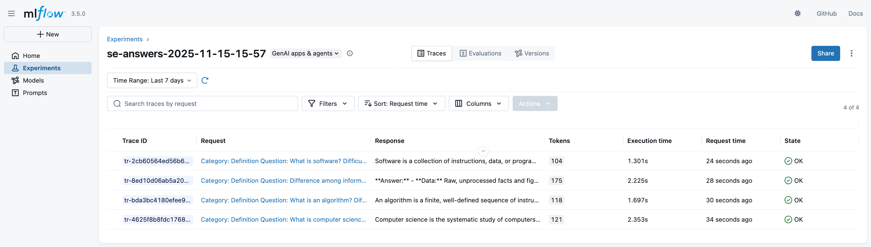 2. Look at the MLflow UI (“Experiments” main section) to see the generation runs: