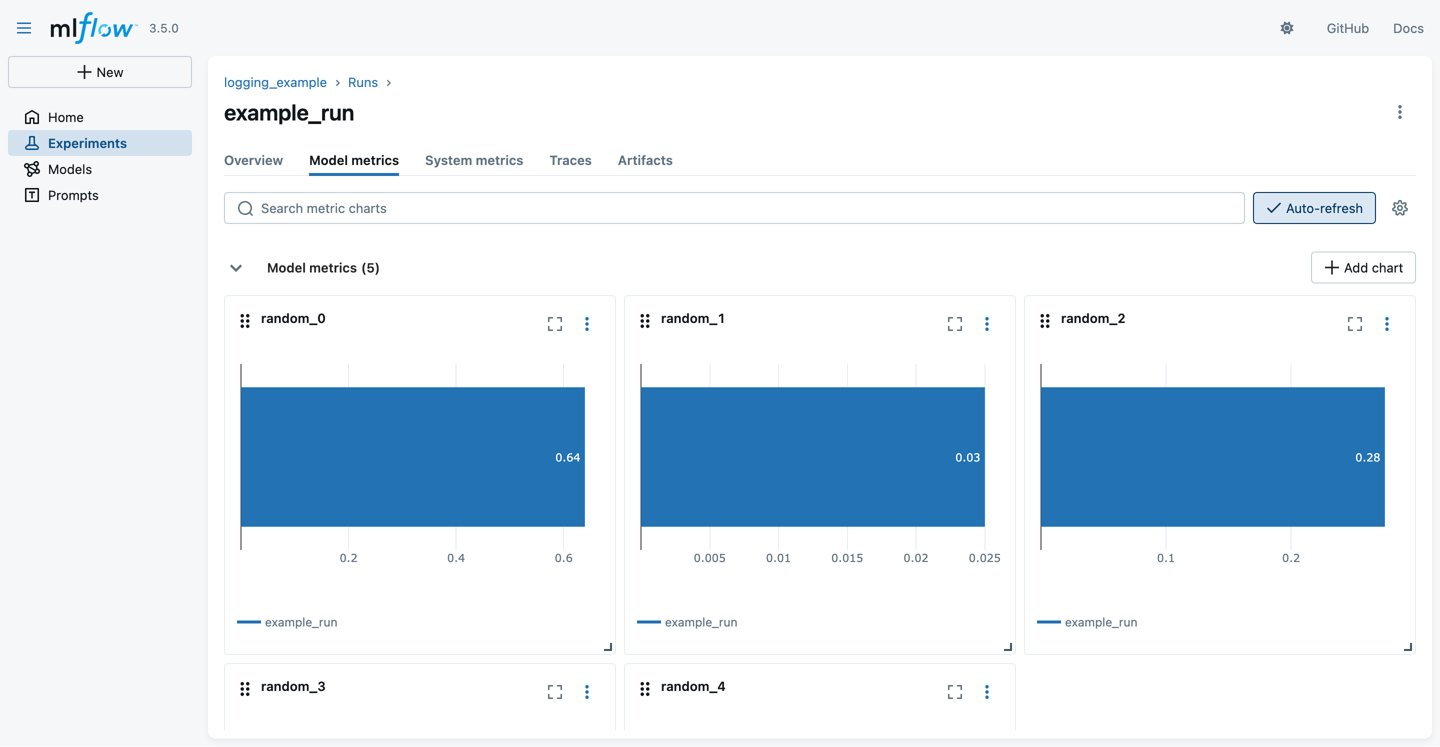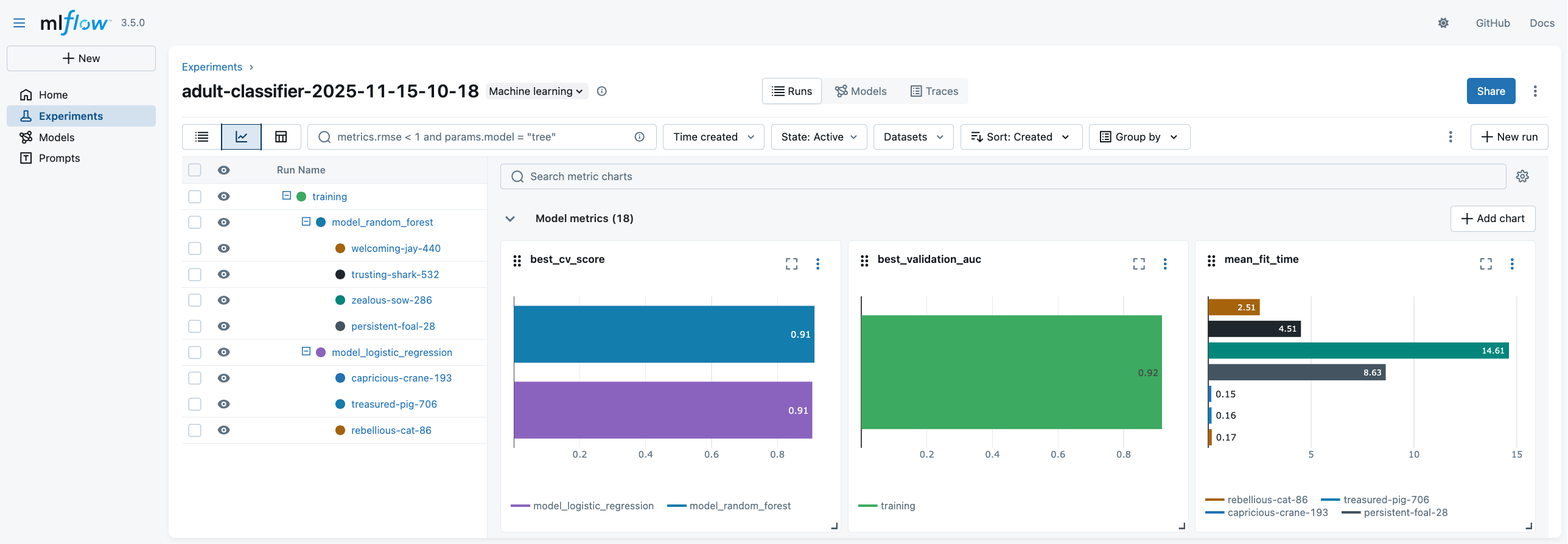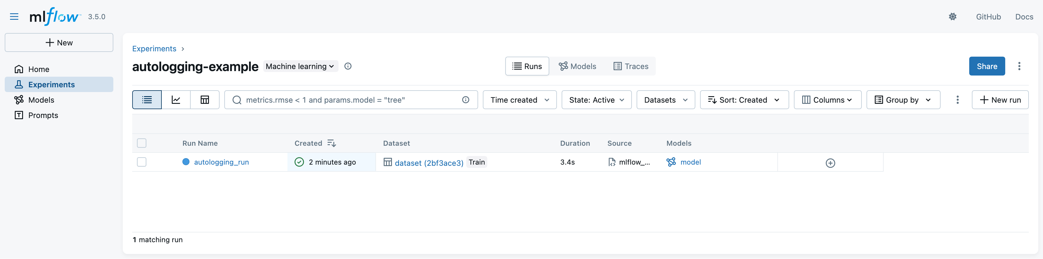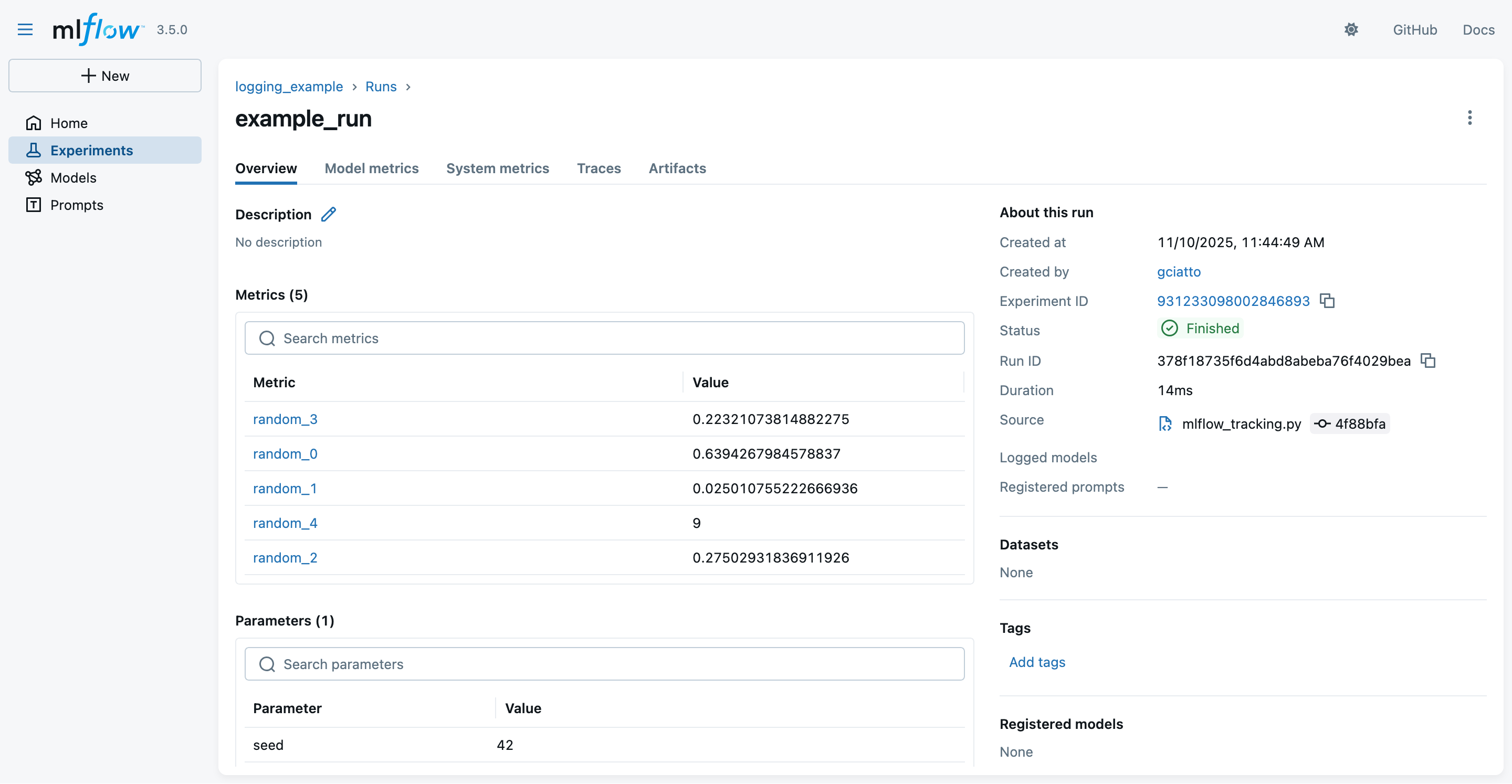 2. Look at the MLflow UI (“Experiments” main section) to see the generation runs: