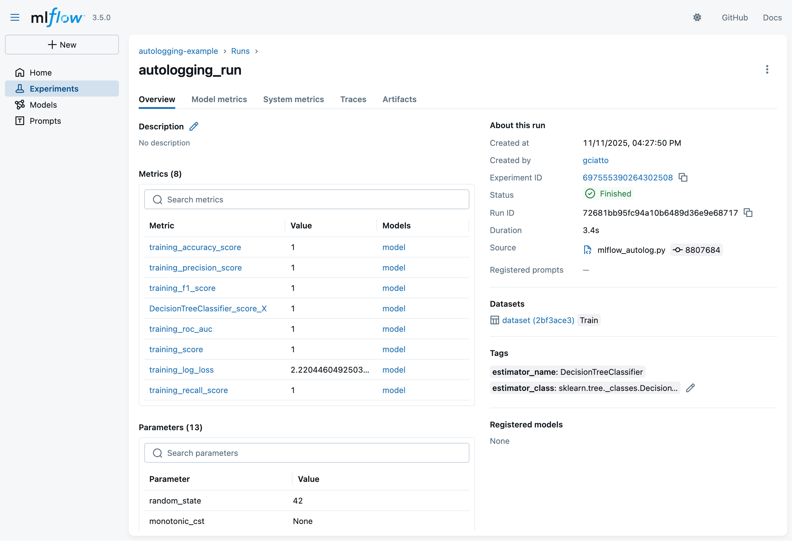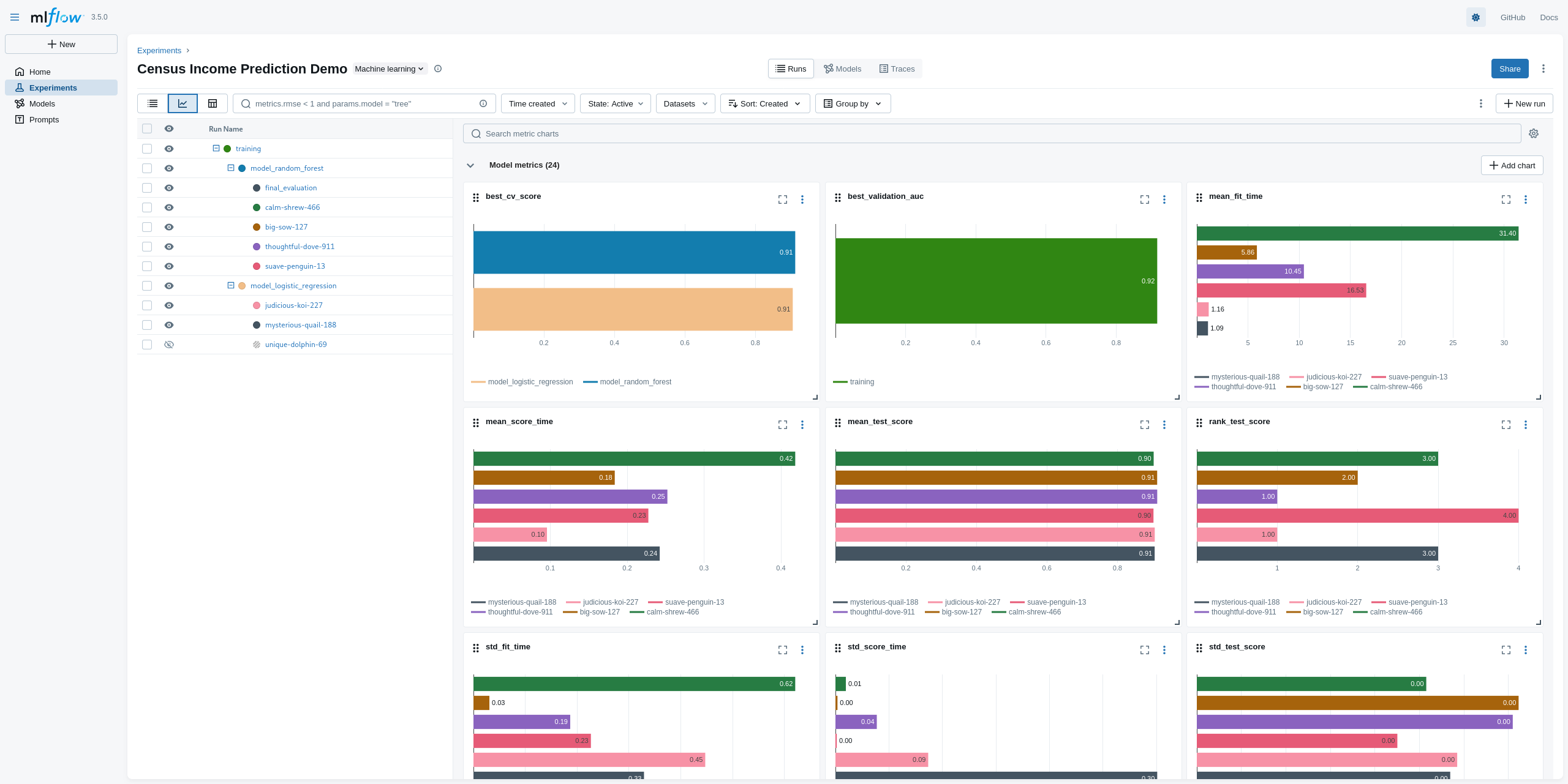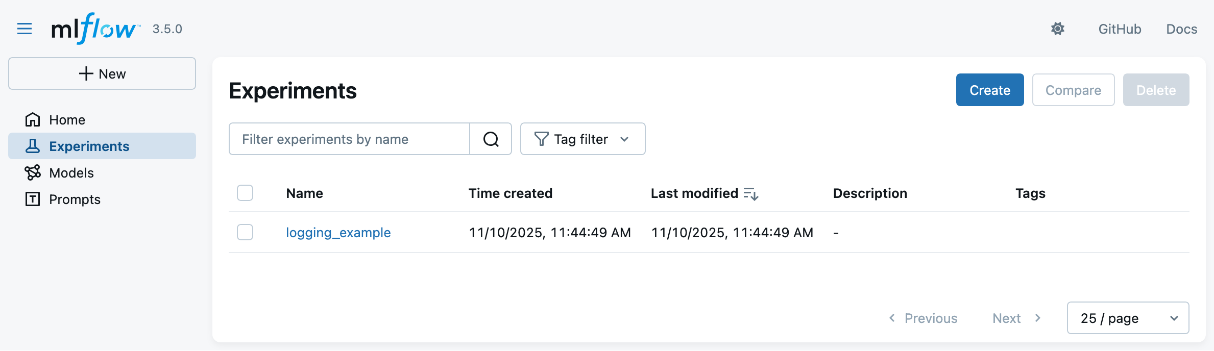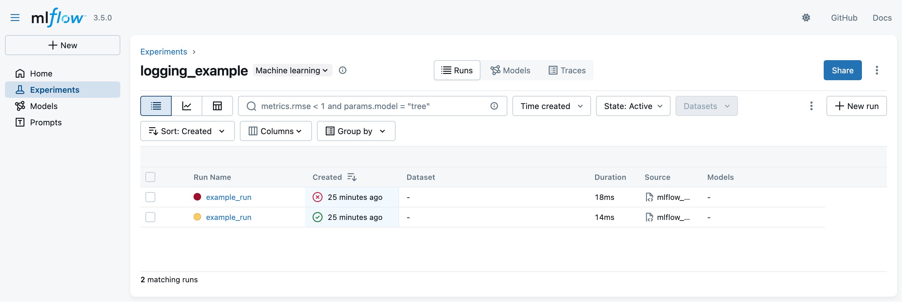 2. Look at the MLflow UI (“Experiments” main section) to see the generation runs: