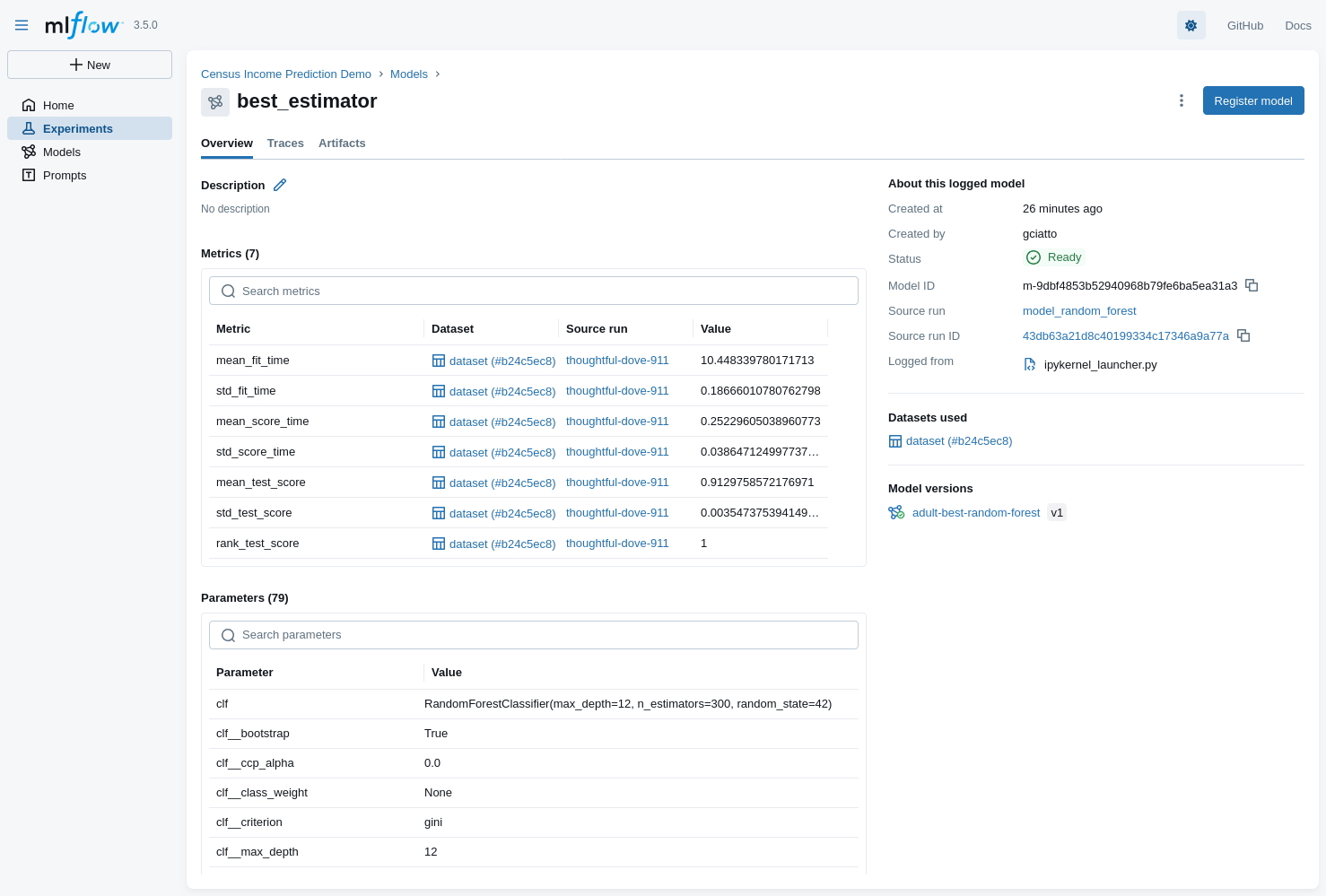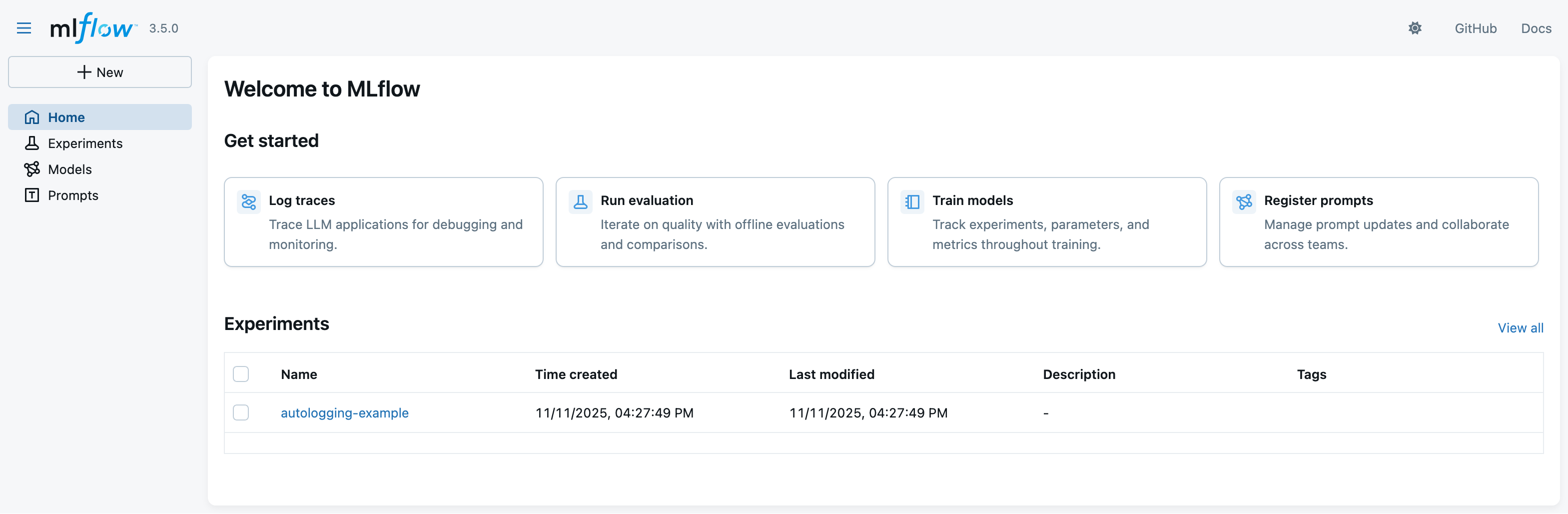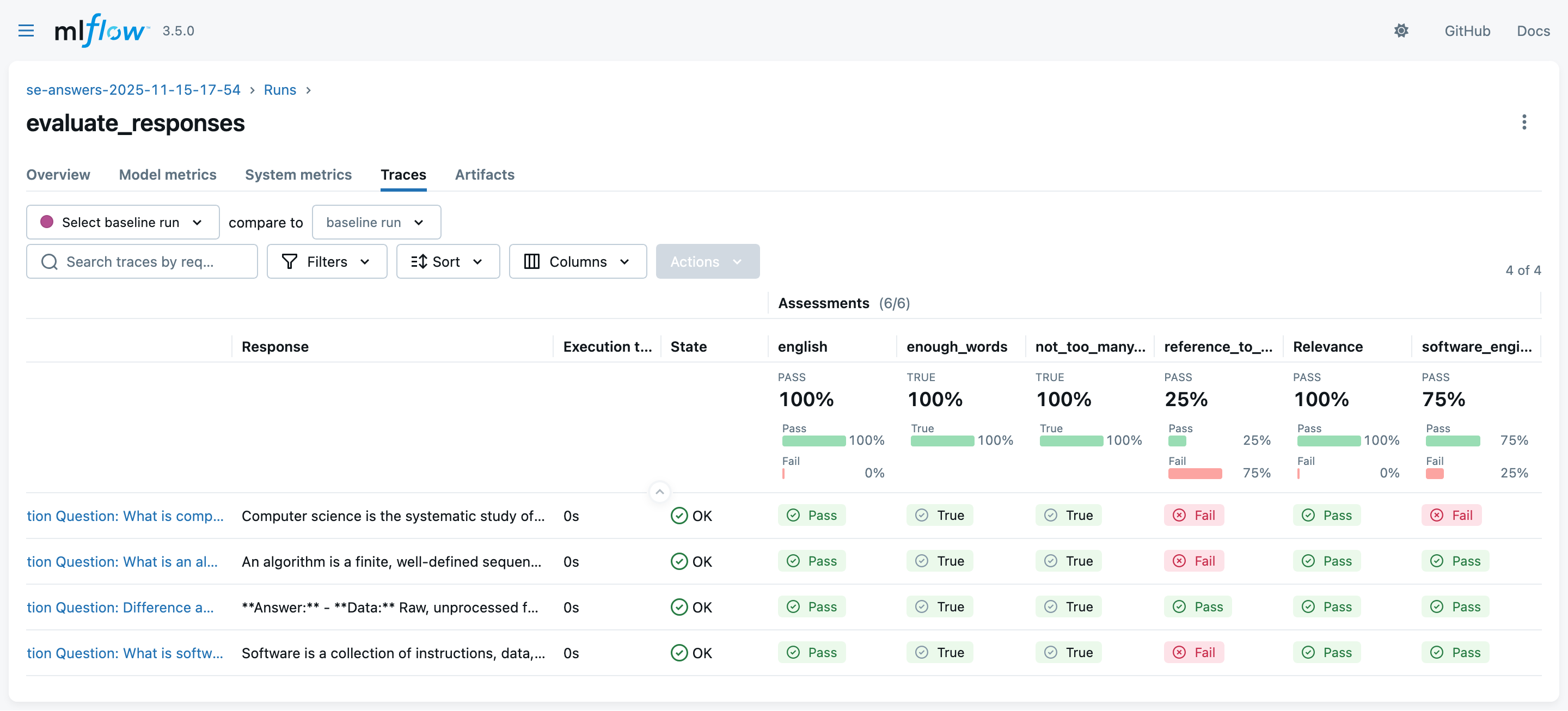 2. Look at the MLflow UI (“Experiments” main section) to see the evaluation runs: